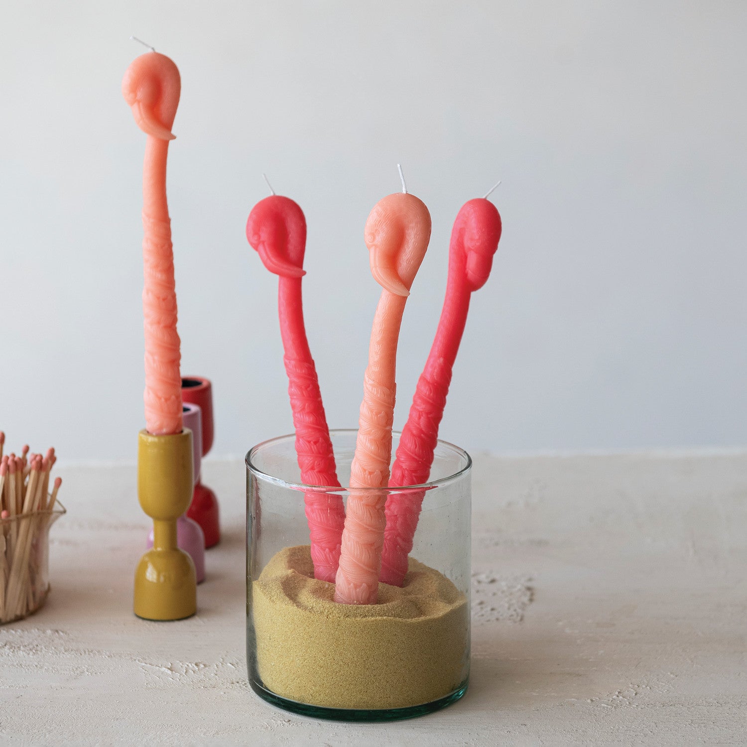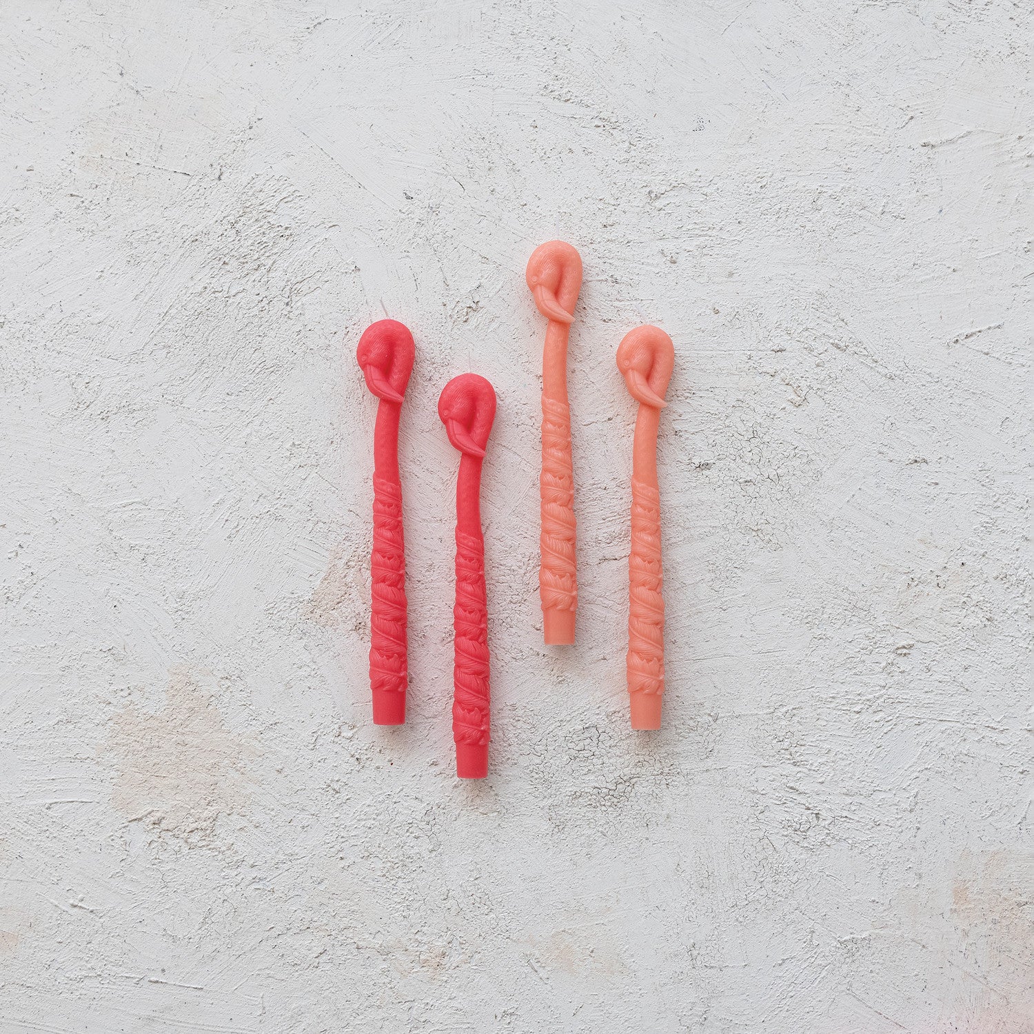 Add a splash of tropical charm to your décor with these whimsical flamingo-shaped taper candles. Standing 10 inches tall, this set of two fuchsia candles brings playful personality to any room. Unscented and designed for ambiance, each candle offers approximately 8 hours of burn time. Perfect for seasonal displays, themed gatherings, or as a unique gift for flamingo enthusiasts. Create a fun, festive atmosphere with these eye-catching decorative candles.