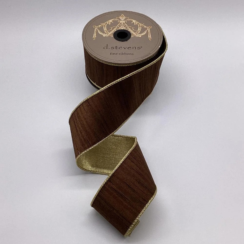 Elevate your gift wrapping, floral design, or holiday décor with this refined walnut slub dupion ribbon from d.stevens. Featuring a sophisticated texture on the front and a metallic gold backing, this ribbon offers two luxurious looks in one. The wired edges provide structure and flexibility, allowing for full, beautiful bows and effortless styling.
