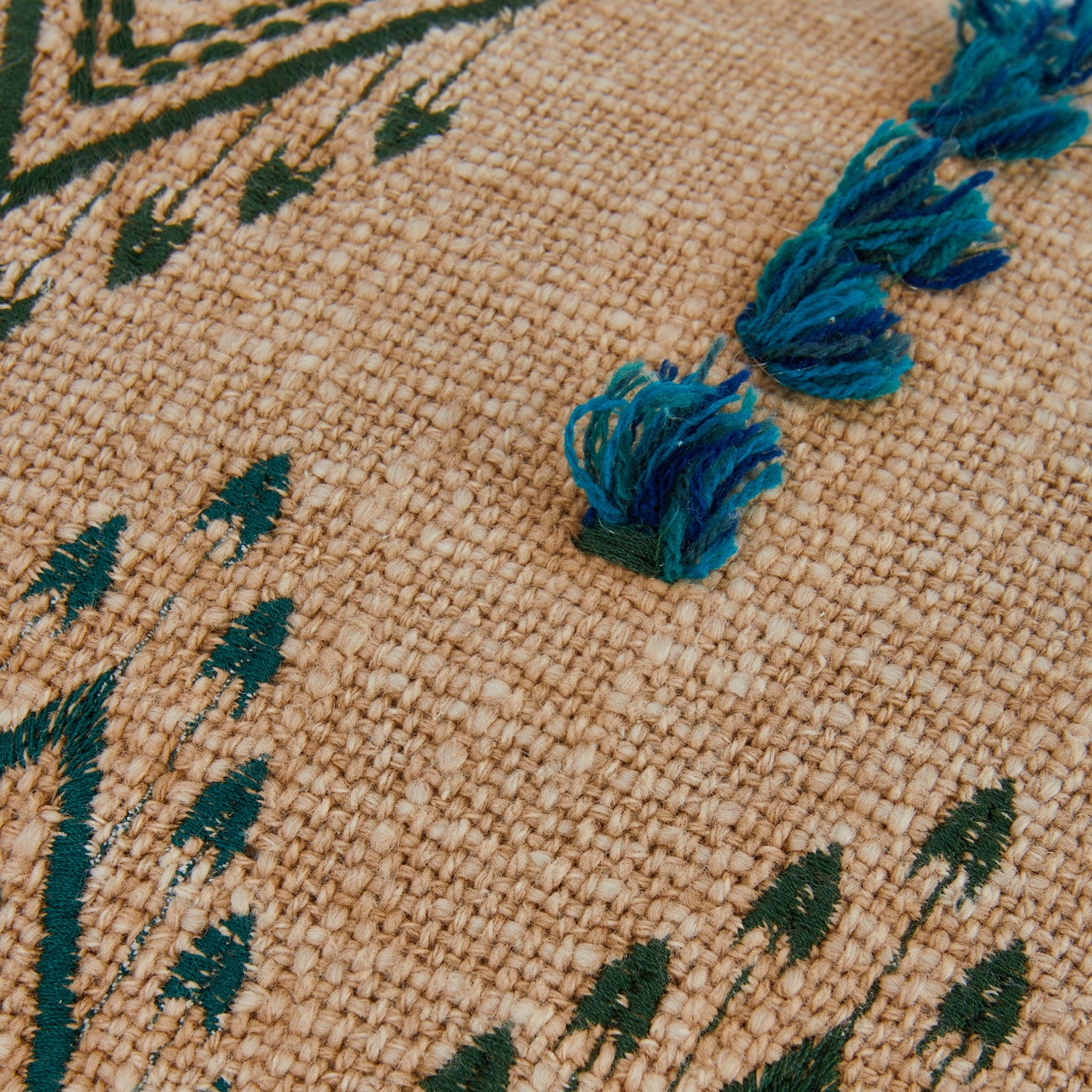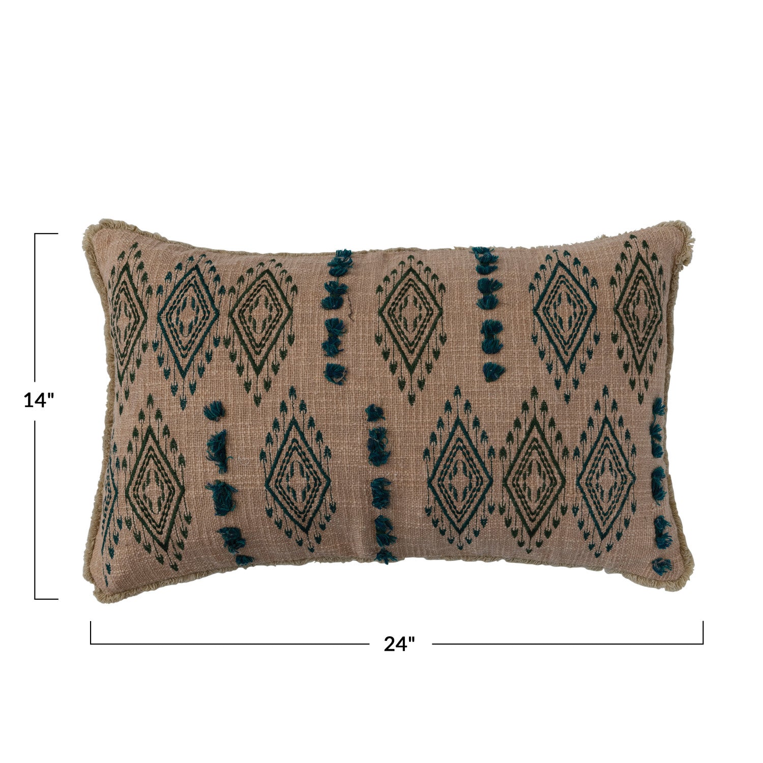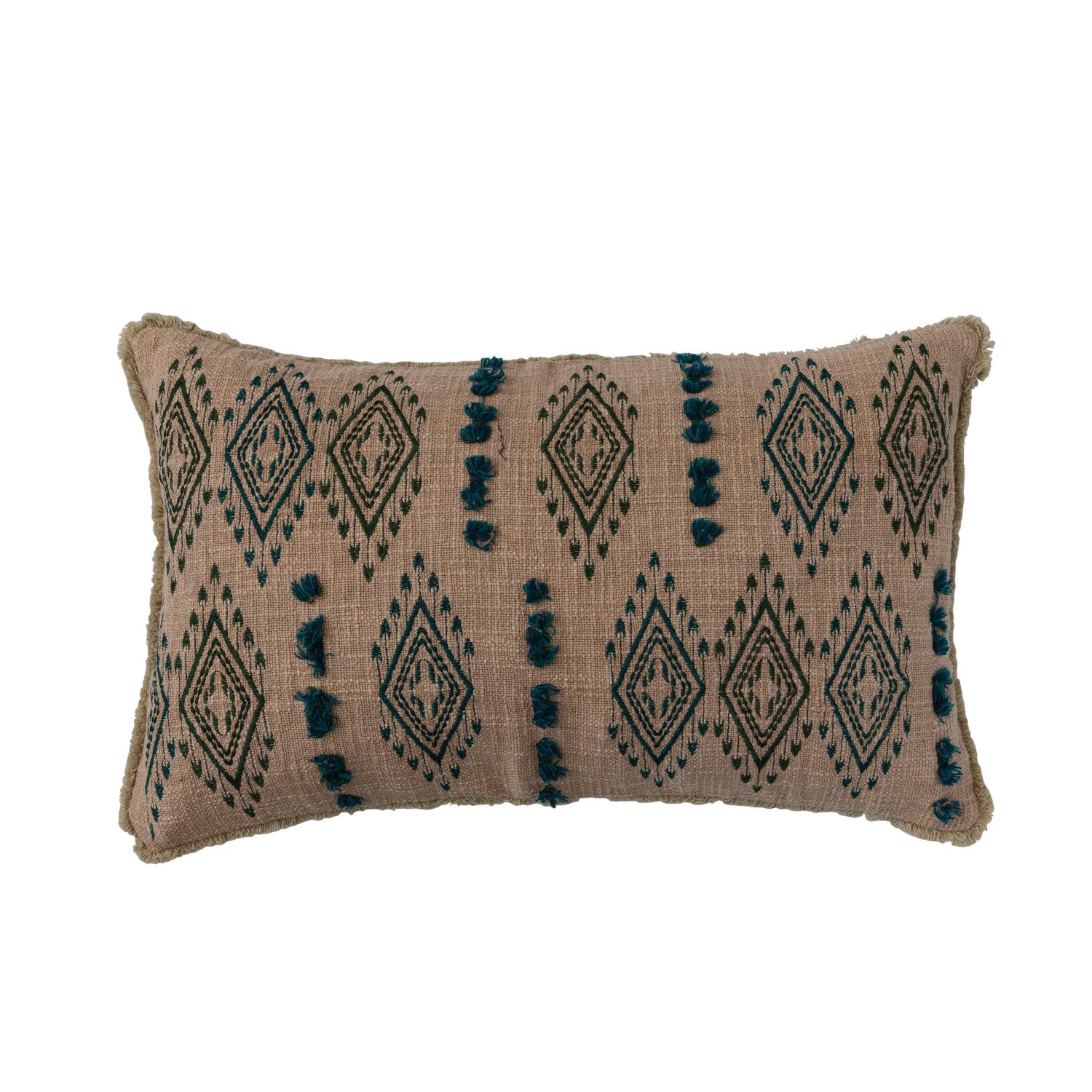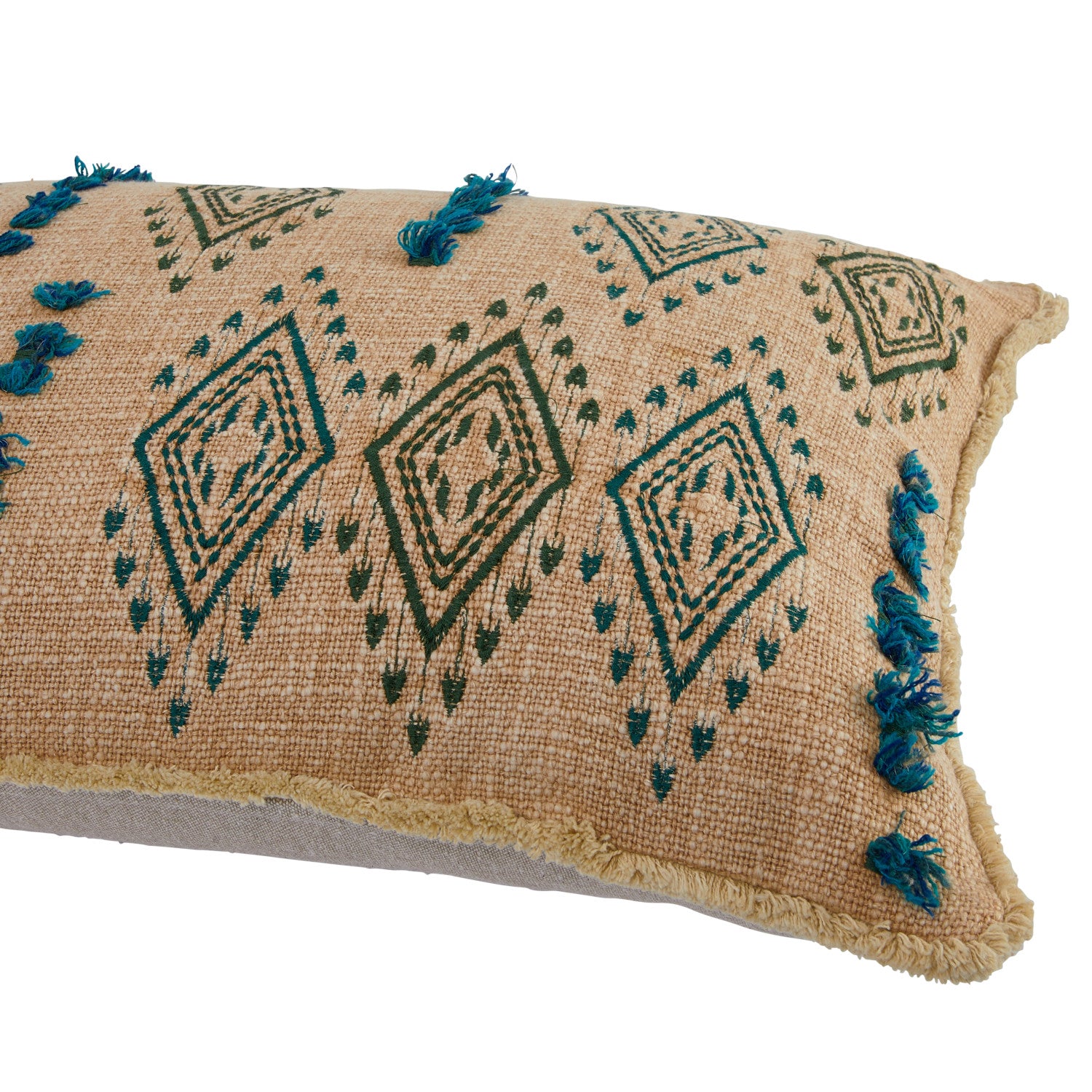 Add warmth and texture to your space with this beautifully detailed cotton slub lumbar pillow. Featuring teal embroidered geometric patterns on a natural woven base, this accent pillow blends global-inspired design with relaxed, everyday comfort. Decorative fringe trim and tufted embroidery create dimension, making it a standout piece on sofas, beds, or accent chairs.