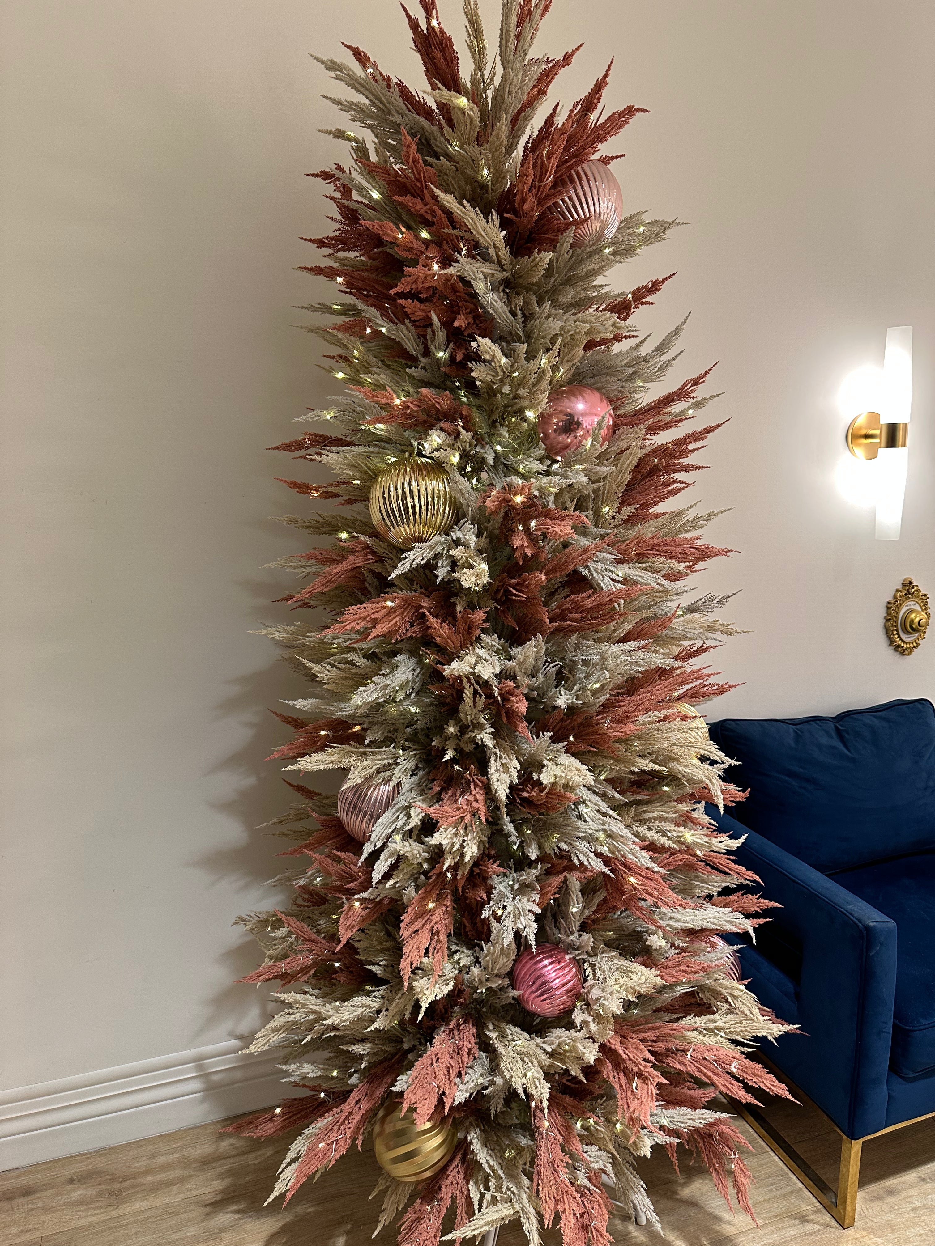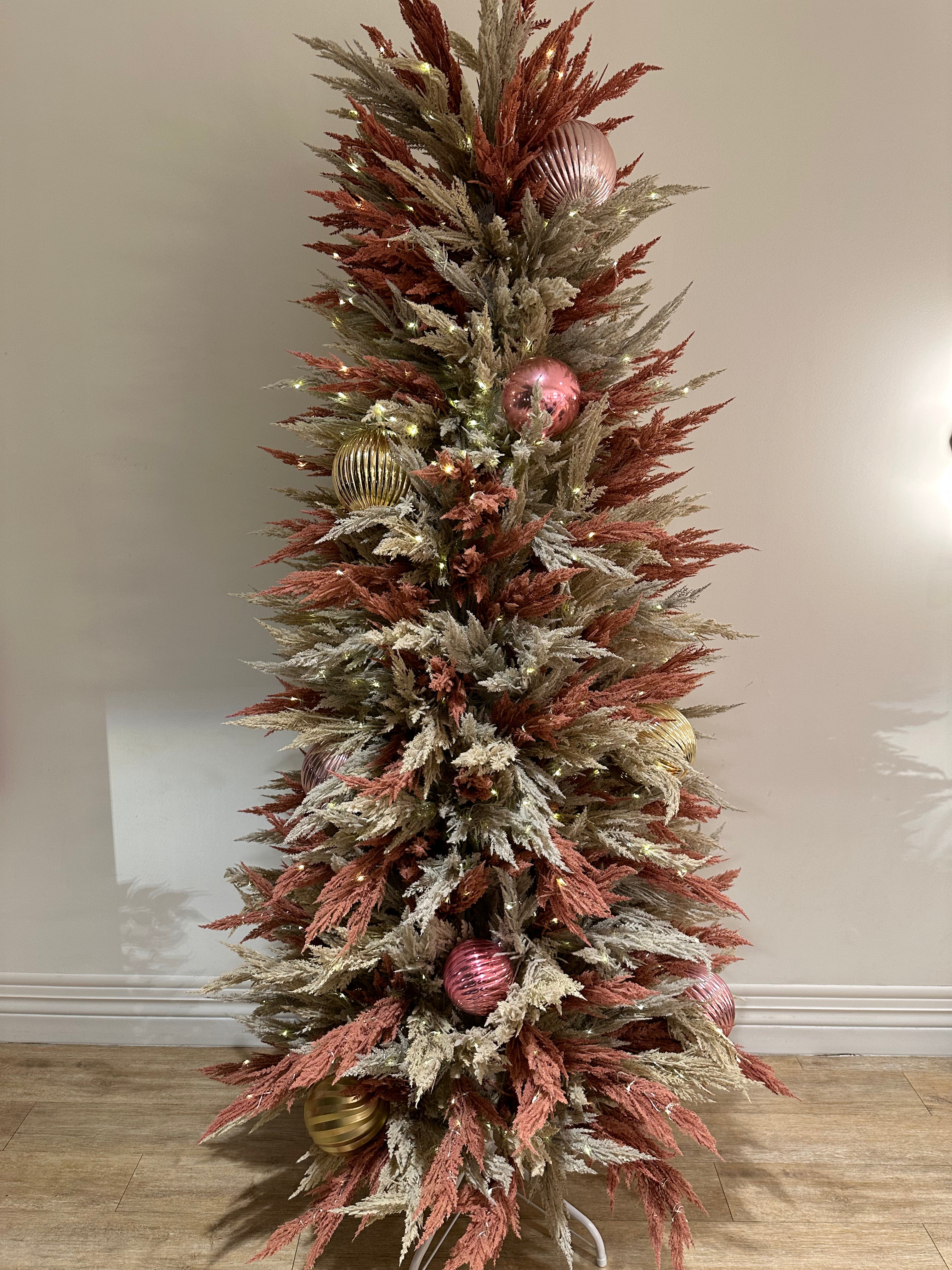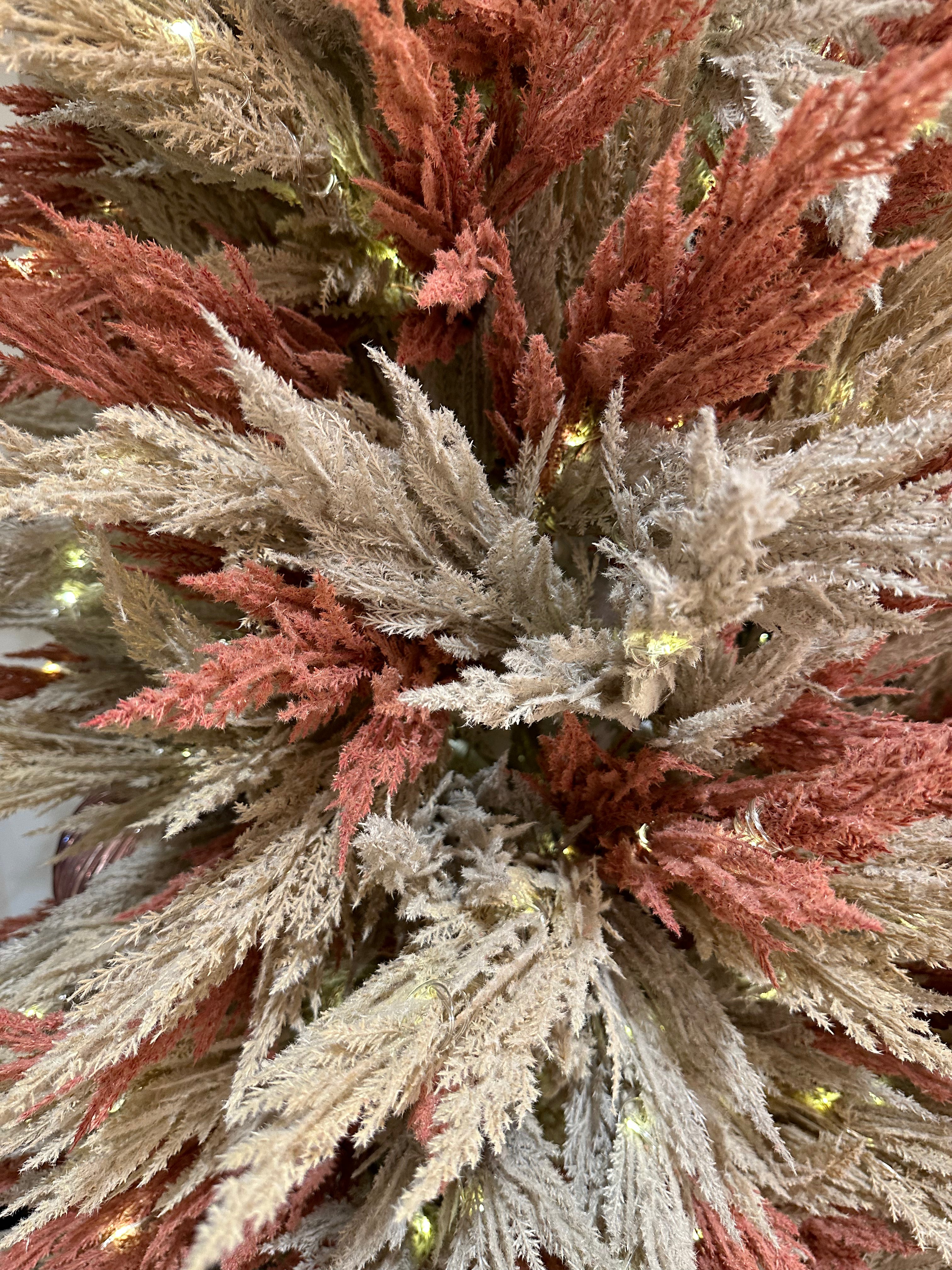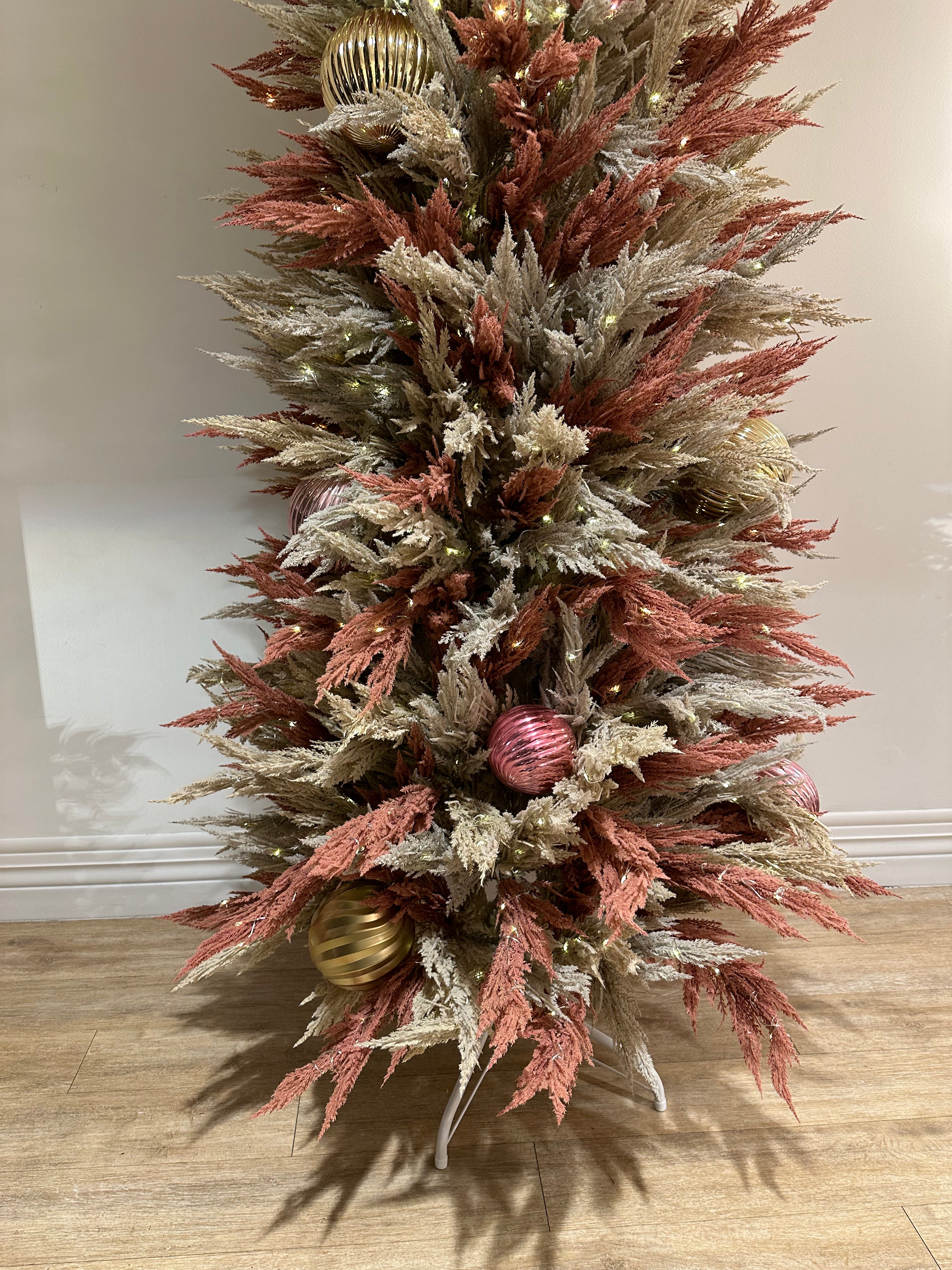 Bring a touch of whimsical coastal charm to your holiday decor with our 7.5' Pampas Grass Tree. This unique artificial Christmas tree features delicately crafted pampas grass branches in cream and pink hues, creating a soft and dreamy ambiance. Adorned with 1000 LED warm white rice lights, it adds a magical glow to your home. With 450 tips and a sturdy metal stand included, it's both beautiful and practical.