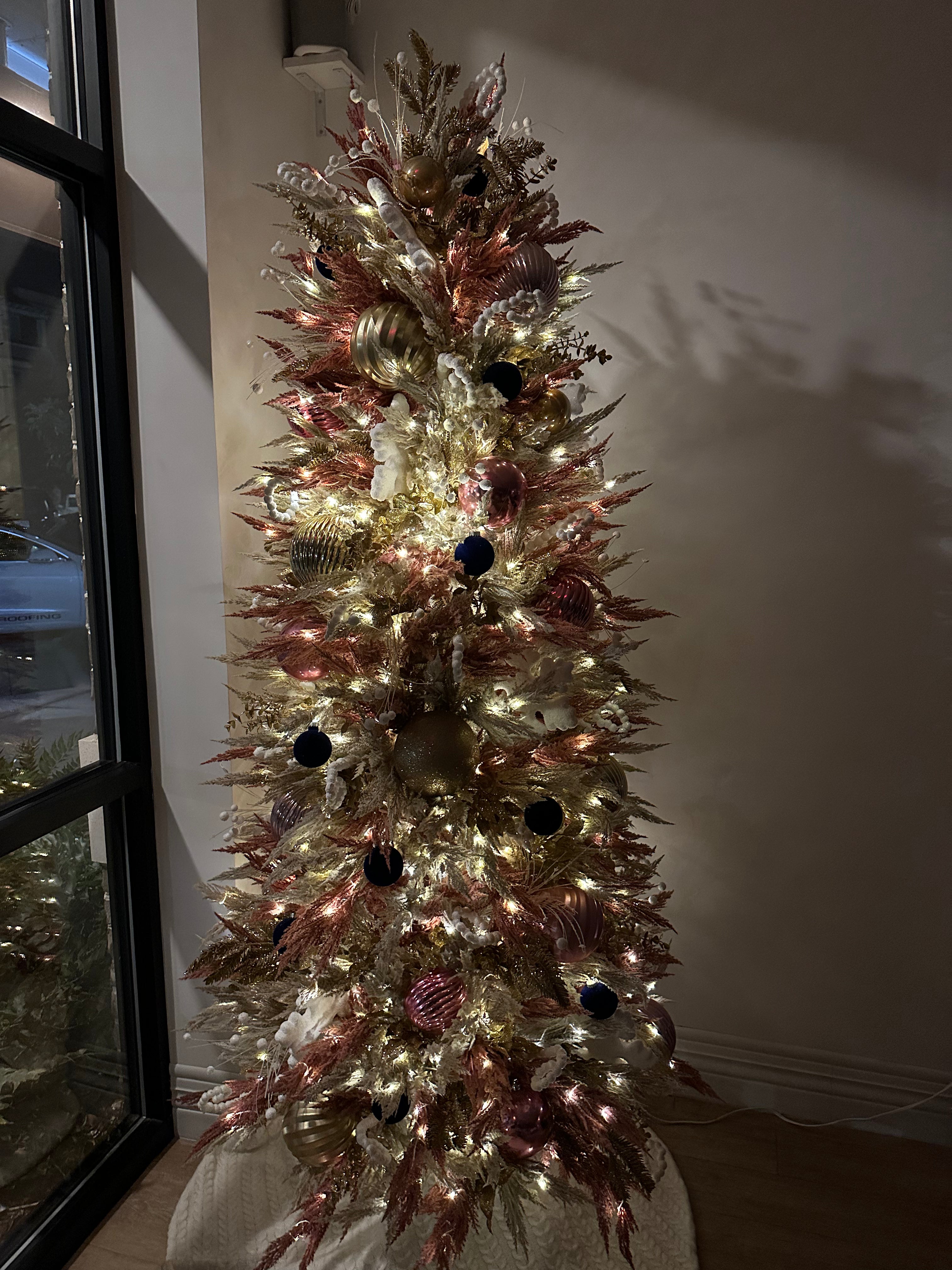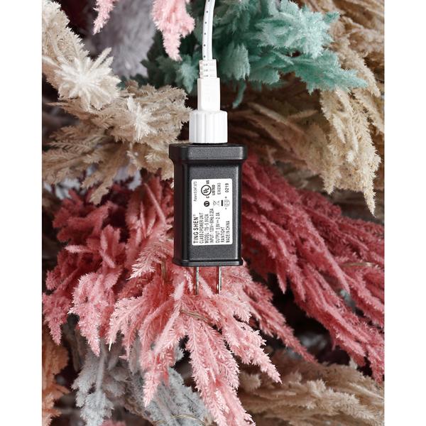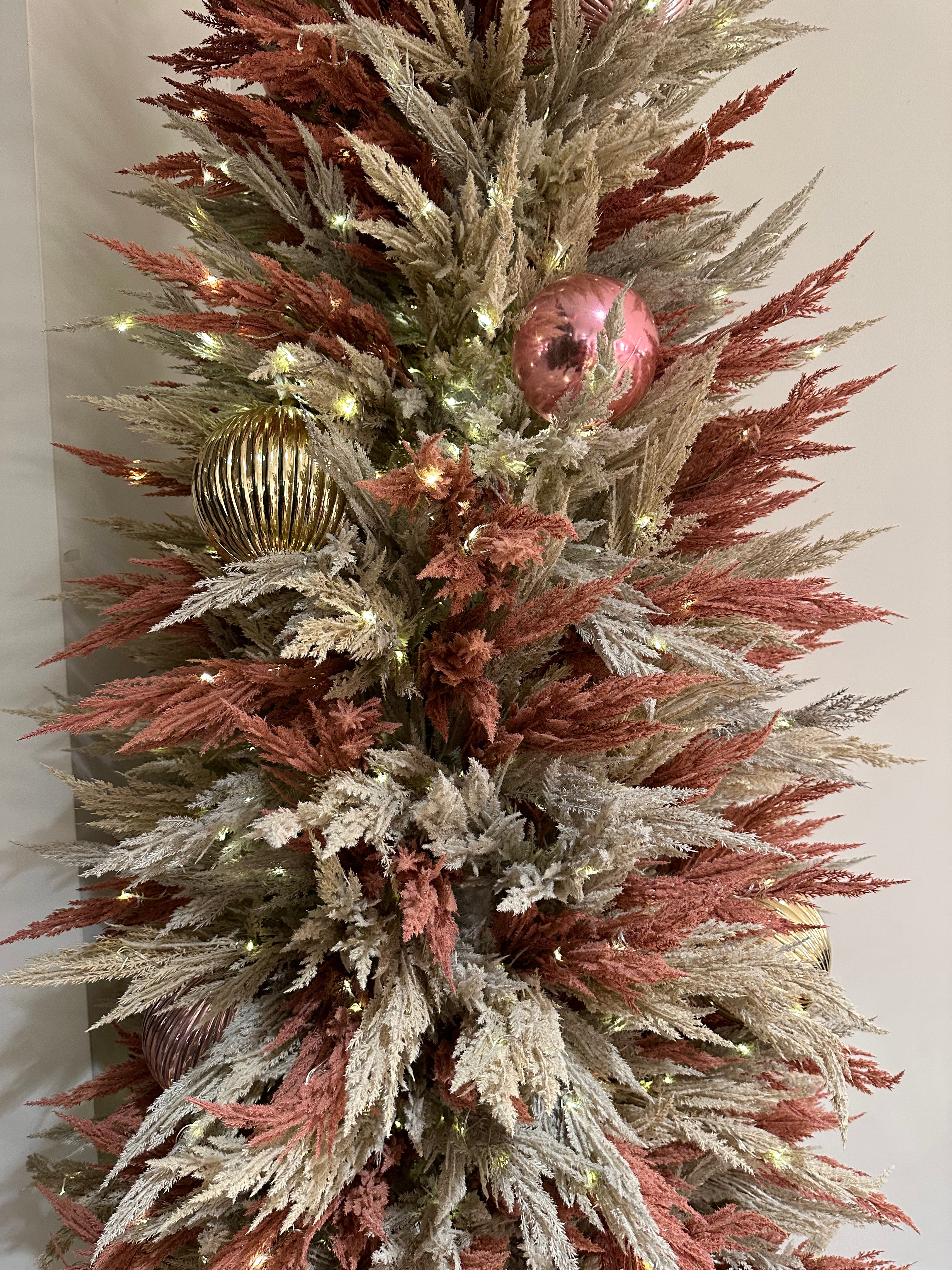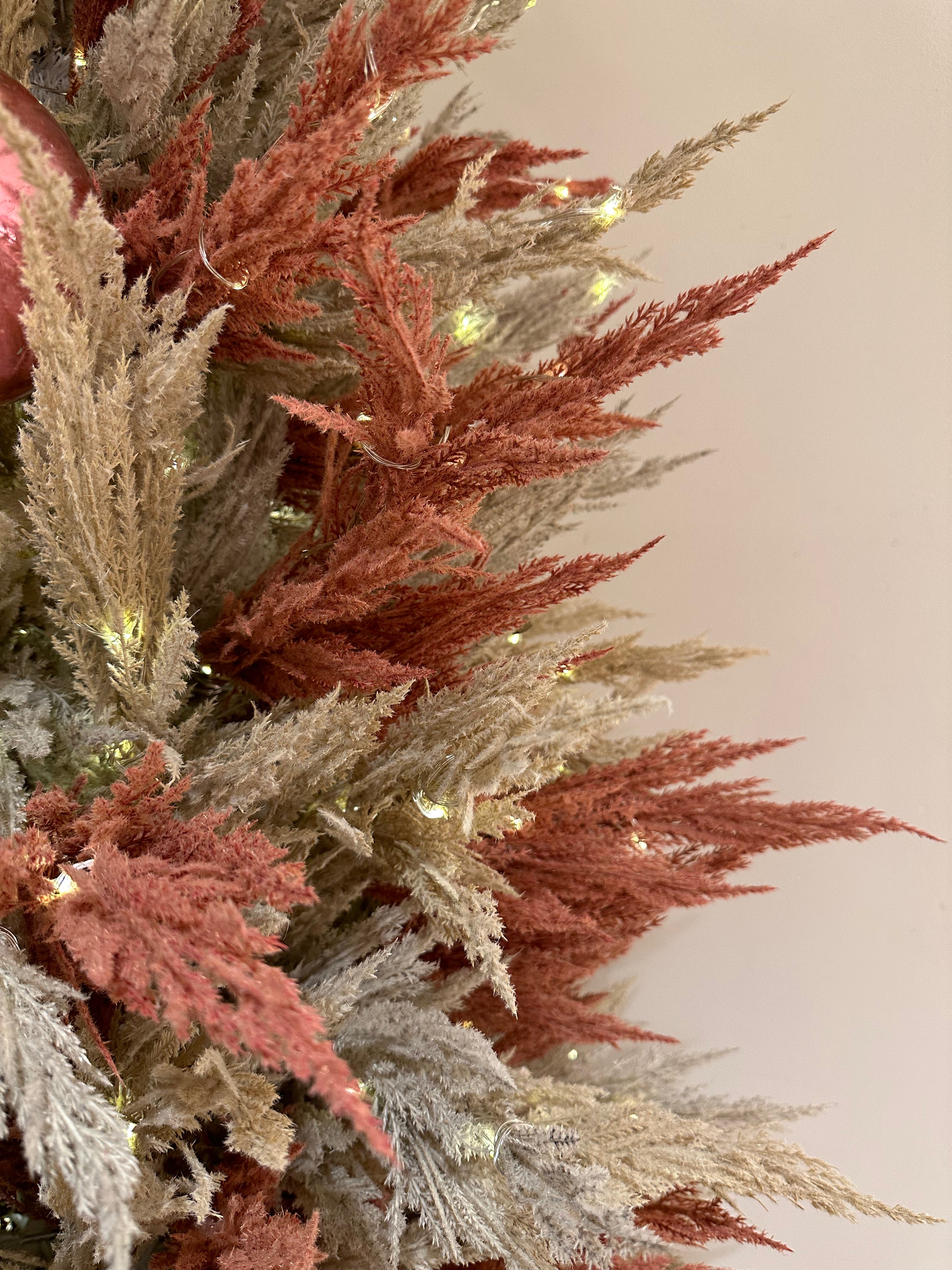 Bring a touch of whimsical coastal charm to your holiday decor with our 7.5' Pampas Grass Tree. This unique artificial Christmas tree features delicately crafted pampas grass branches in cream and pink hues, creating a soft and dreamy ambiance. Adorned with 1000 LED warm white rice lights, it adds a magical glow to your home. With 450 tips and a sturdy metal stand included, it's both beautiful and practical.