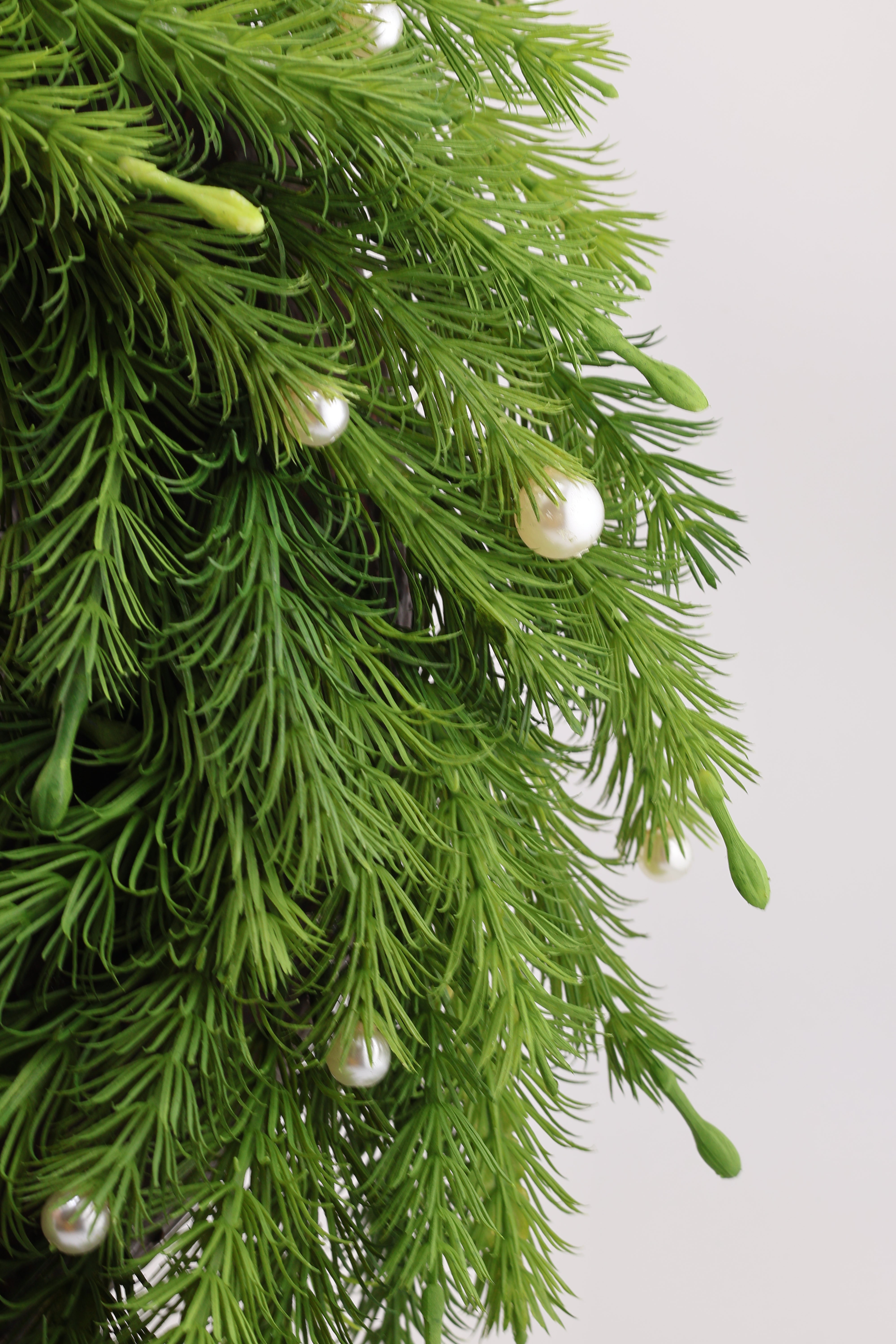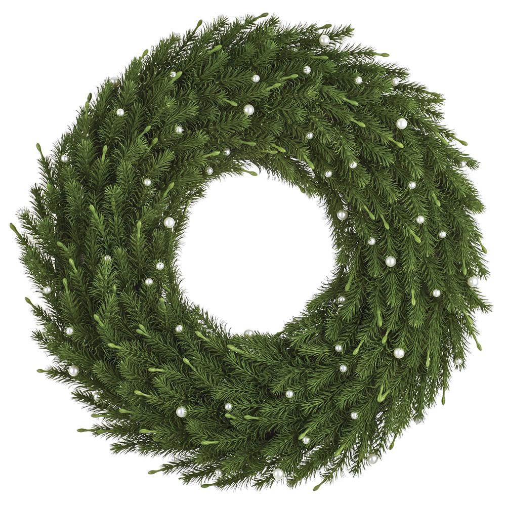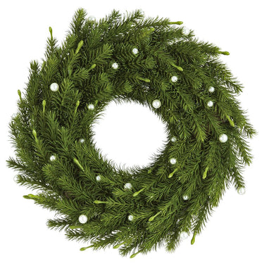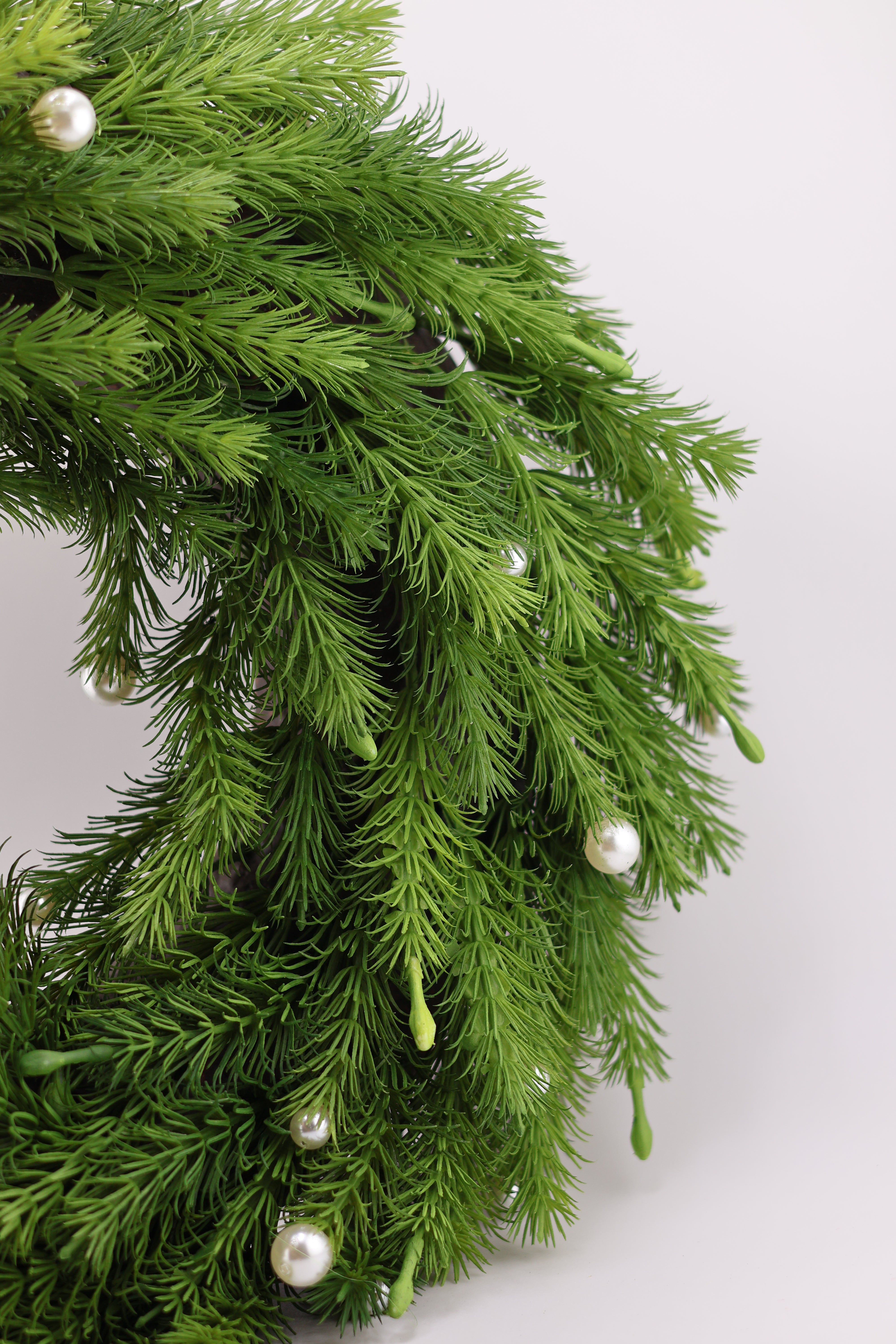 Add timeless elegance to your holiday décor with the Pearl Pine Wreath. This lush green wreath features lifelike pine branches adorned with delicate pearl-like accents, creating a sophisticated winter look. Perfect for doors, walls, or above a mantel, it brings a refined seasonal touch to both traditional and modern holiday styles.