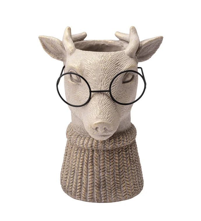 Add a scholarly touch to your holiday decor with the Booksmart Sweater Reindeer. Featuring a sculpted reindeer head in a cozy cable-knit textured sweater and a pair of removable round glasses, this piece brings festive charm with a side of wit. Whether used as a planter or a quirky decorative accent, it's guaranteed to spark conversation and holiday cheer.