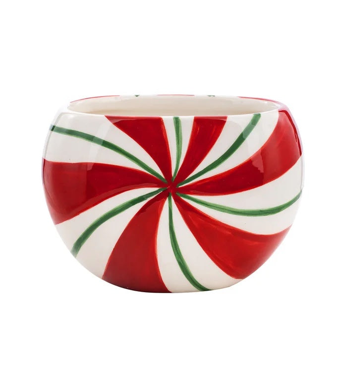 Bring sweet holiday charm to your home décor with the Peppermint Candy Planter. Featuring a vibrant swirl of red, white, and green, this round ceramic planter is perfect for holding seasonal greenery, poinsettias, or candy canes. Its glossy finish and festive design make it a standout piece for any Christmas display.