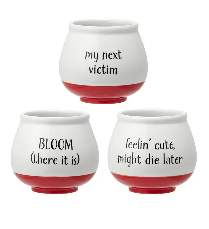 Bring humor and charm to your plant collection with these witty red and white ceramic planters. Each pot features a playful saying that makes it the perfect conversation starter. Designed at 3.5" high with a 3" opening diameter, these planters are ideal for succulents, herbs, or small houseplants. Choose from three cheeky quotes to suit your mood or mix and match for a fun display. These planters also make fantastic gifts for plant lovers who enjoy a touch of humor in their décor.