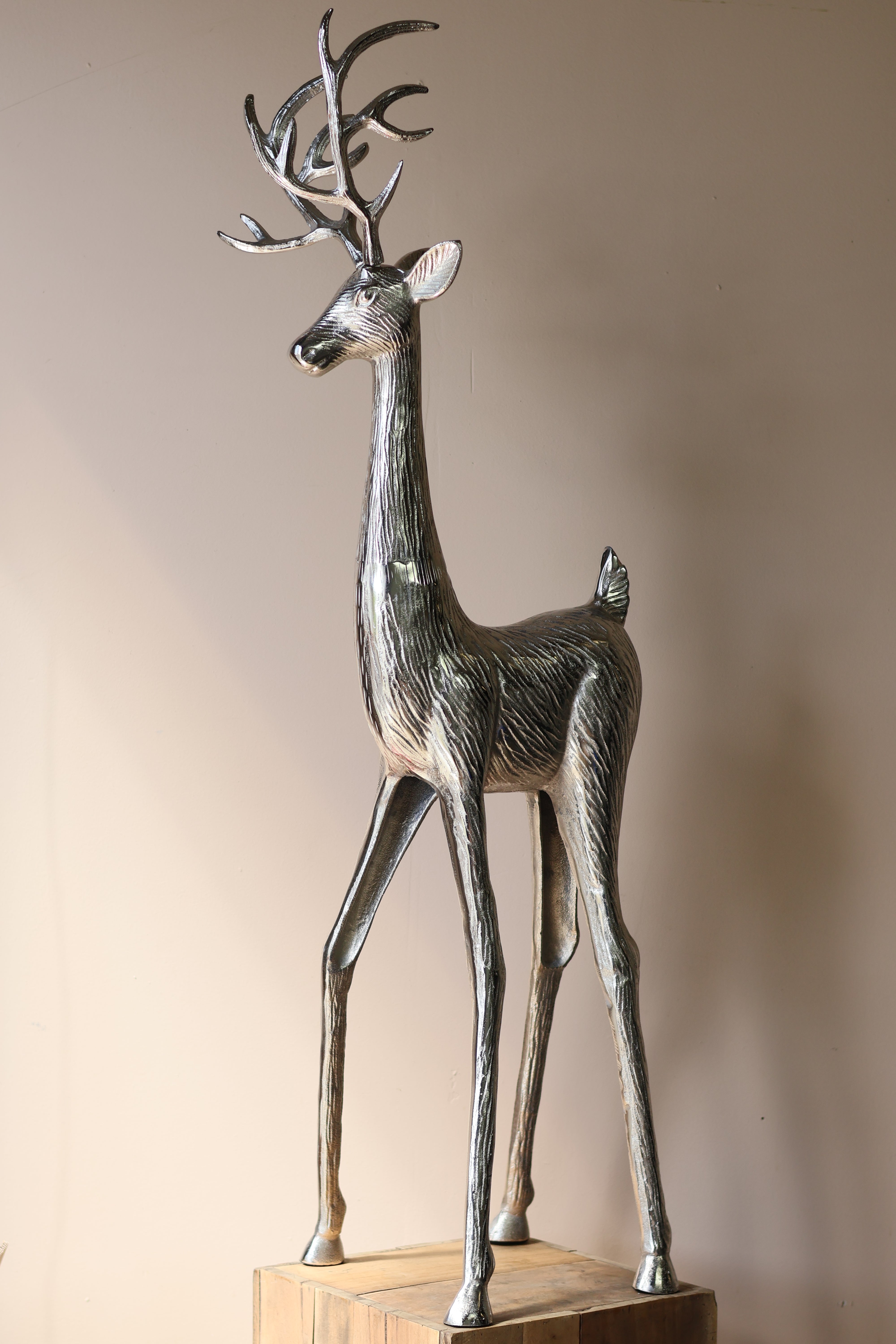 Bring a touch of sophistication to your holiday or year-round décor with this striking aluminum deer sculpture. Featuring a sleek silver finish and detailed antlers, this tall and graceful figure makes a bold statement wherever it’s placed. Its timeless design allows it to blend beautifully with both traditional and modern styles.