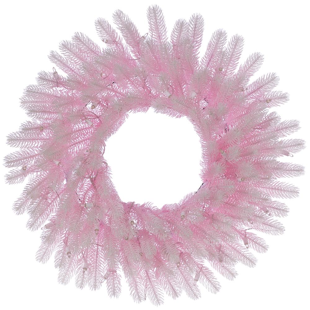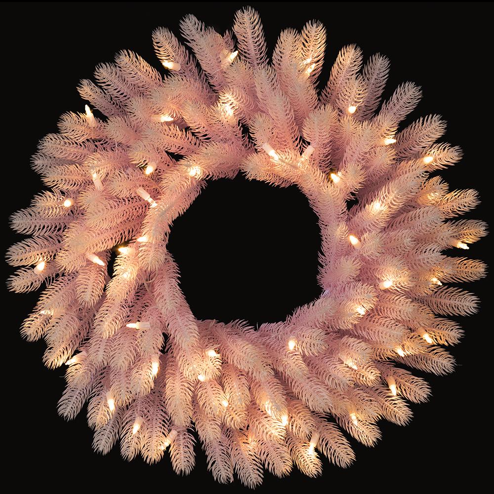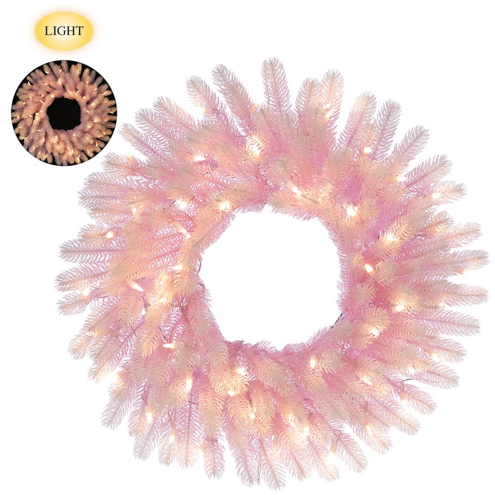 Welcome the season with the 24" Blush Noble Fir Pre-Lit Wreath, featuring 144 lush tips and 50 warm LED lights. This elegantly tinted wreath combines the natural look of noble fir with a soft blush hue, creating a charming and inviting holiday accent. Its pre-lit design offers effortless ambiance, making it perfect for doors, walls, or windows. Durable and ready to display, it adds festive beauty and cozy glow to your home décor.
