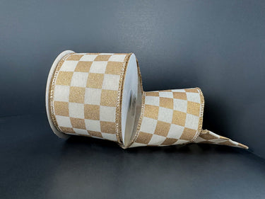 Checkered Pattern Ribbon, Cream/Gold, 2.5" x 10Y