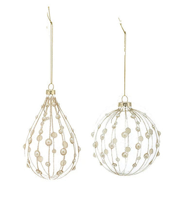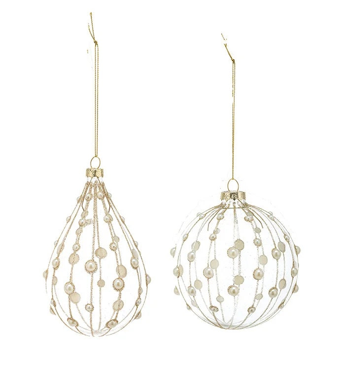 This elegant set of two glass pearl bead ornaments includes teardrop and round shapes measuring 4.5" and 5.25" in height. Their delicate pearl bead detailing adds a refined and timeless touch, perfect for bringing understated sophistication and classic charm to your holiday décor.